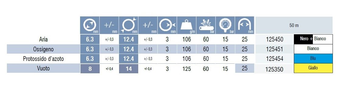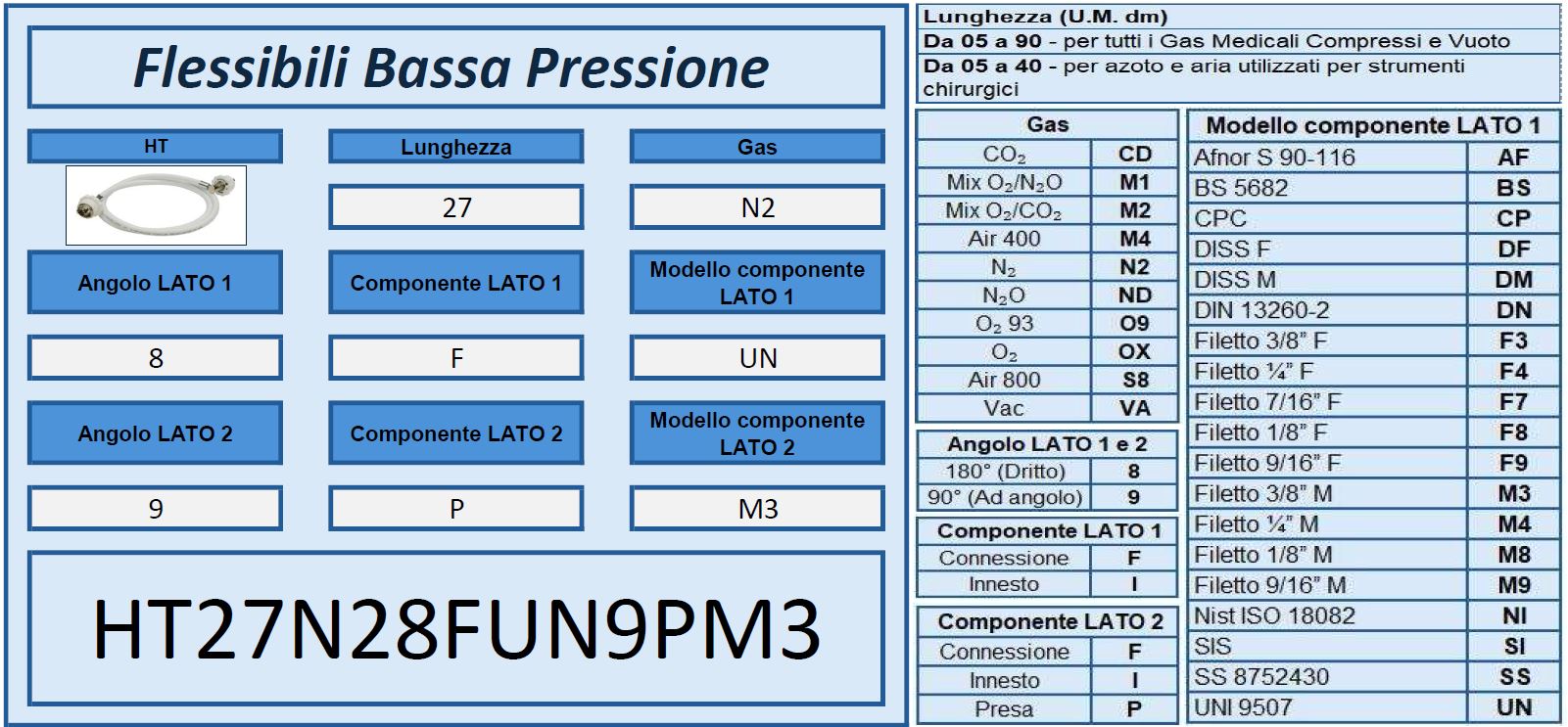 Low pressure flexible connection for medical gases and vacuum, the flexible connection is used to connect medical equipment to the centralized medical gas system; flexible connections consist of EN 5359 standard hose with a probe crimped on each end, or alternatively a probe and a socket, refer to the web site for the product code or contact the Company directly.