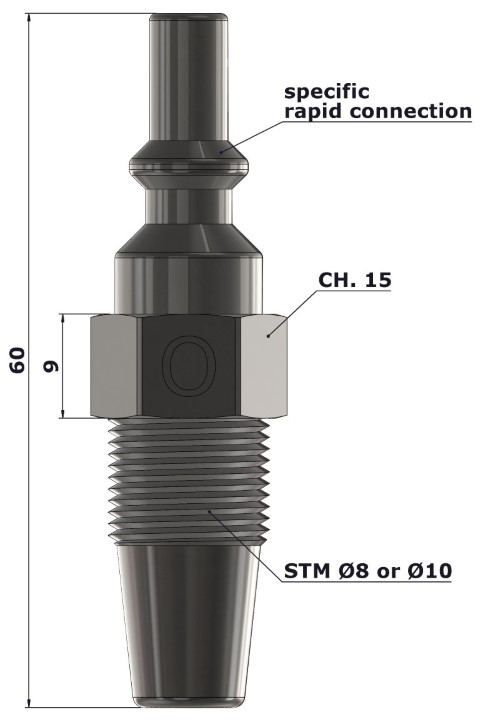 Male probe with an EN 561 standard profile on one side and a metal hose clamp profile for Ø 8/10 mm hoses on the other side.Each profile has a different size to prevent wrong connections between comburent and fuel gases.