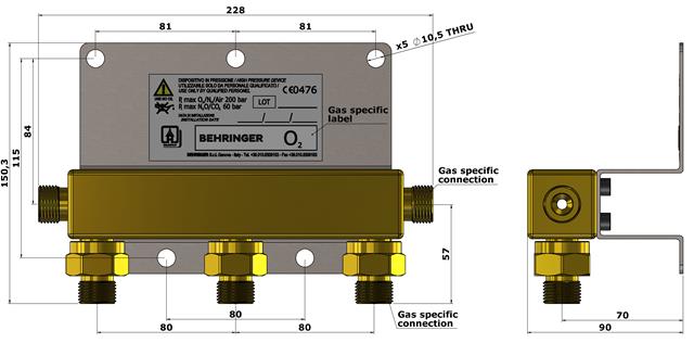Rampa di collegamento bombole realizzata da unico collettore in ottone nichelato, a due o tre posti; connessione ingresso e uscita gas specifica; dotata di tappo per ingresso lato sx; valvola di antiritorno incorporata nell'attacco in ingresso; completa di staffa di fissaggio in acciaio inox; realizzata in materiali compatibili con i gas e le norme applicabili nel settore gas alimentari; è possibile collegarla ad un'altra dello stesso tipo tramite il collegamento dritto.