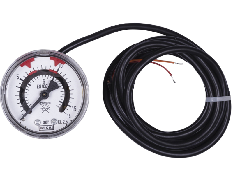 Electric contact pressure gauge compatible for medical use, class 2.5; when the pressure drops below the threshold, the device sends a signal to the alarm to which it is connected.