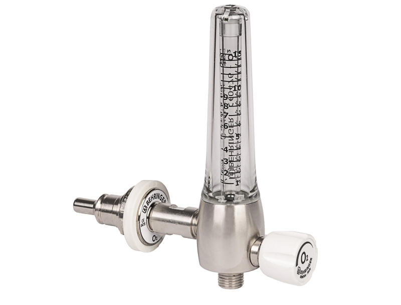 Caudalímetro de área variable para dosificación del oxígeno y del aire medicinal; escala de 0 a 15 l/min; puede ser conectado a la red de distribución de los gases medicinales a través de conexiones adecuadas de acuerdo a las normativas AFNOR NF S 90-116, DIN 13260-1, UNI 9507, BS 5682, SS, roscado G 1/4" M RH; disponible también con abrazadera de ABS para fijación en barras porta equipos con conexión de gas específica; el dispositivo permite, a través de la regulación de la válvula de aguja, un flujo de 0 a 15 l/min a una presión de 4,5 bar.